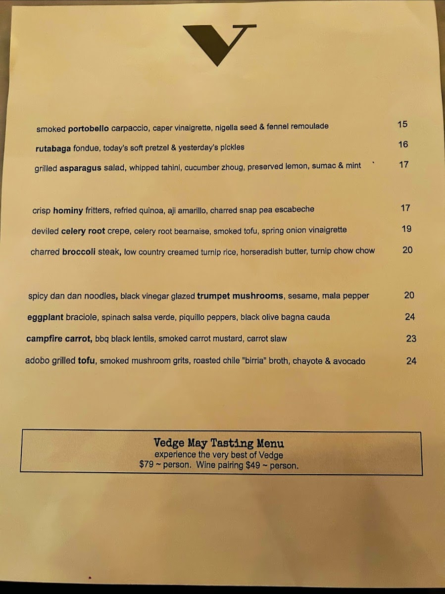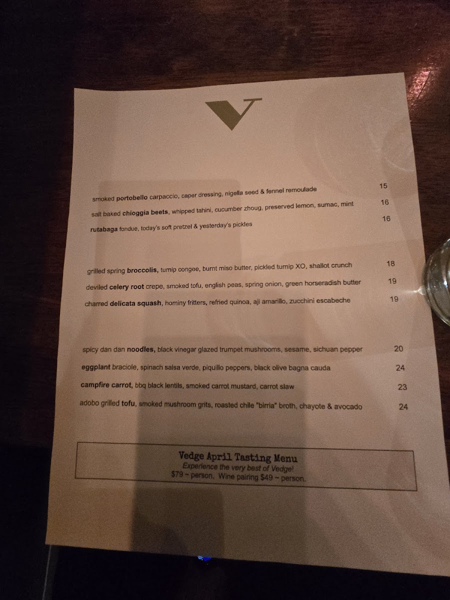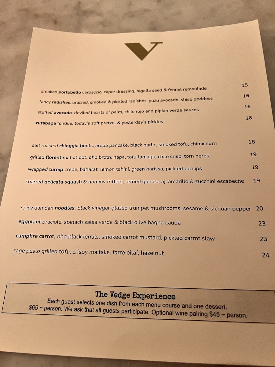 The dinner menu at Vedge is a journey through flavor profiles, showcasing the chef's dedication to fresh, seasonal ingredients. Indulge your senses with starters like Deviled Hearts of Palm adorned with heirloom tomatoes, grilled poblano, and green tomato aguachile for $13.00, or the Smoked Portobella Carpaccio featuring caper vinaigrette, fennel remoulade, and nigella seed for $14.00. Each dish is expertly crafted to highlight the natural flavors of the ingredients, proving that plant-based doesn’t mean compromising on taste or creativity.